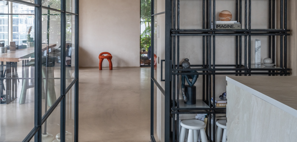 The office’s design language comes alive through an interconnection of visible details from eccentric lighting installations to tables crafted with concrete tops and natural stone surfaces. Techniques such as wood charring add a layer of craftsmanship and contrast, as seen in one of the striking bookracks that doubles as a stunning sculptural creation at the workstation.