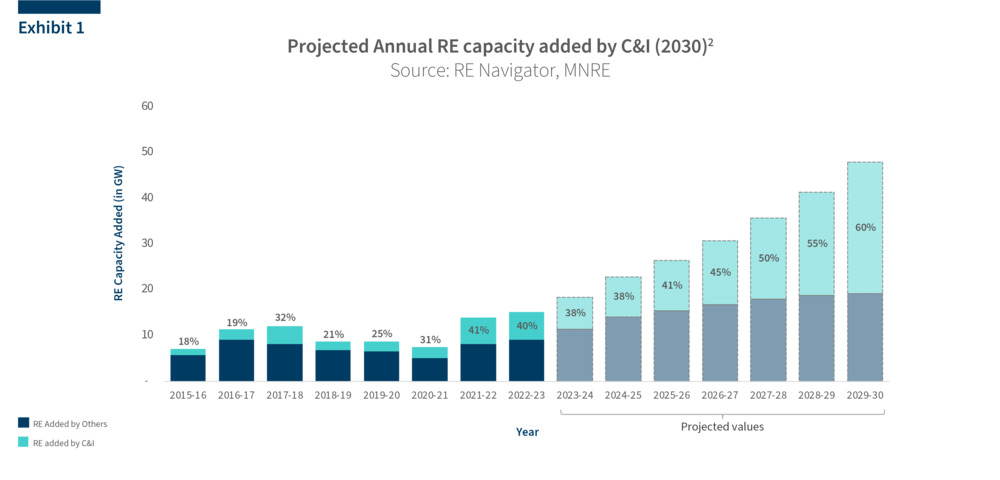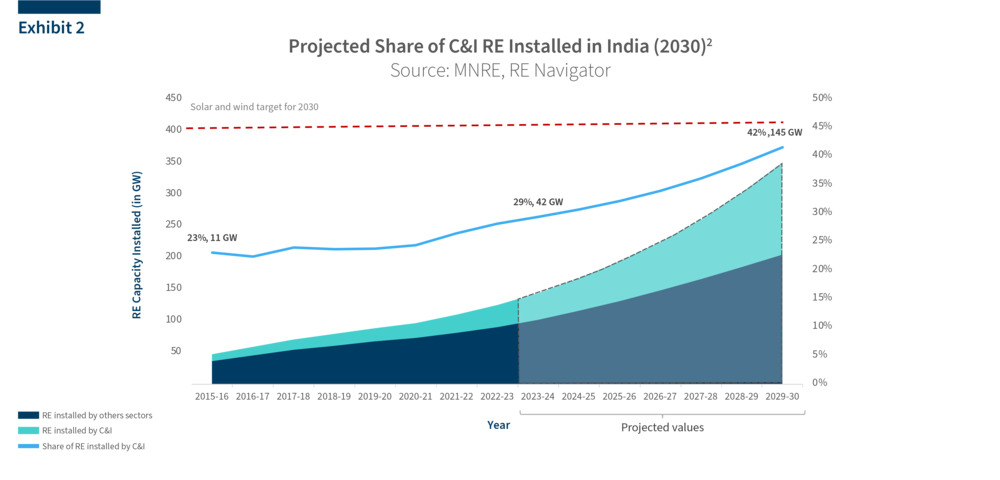 When viewed cumulatively, nearly 30% of India’s RE installed capacity till date can be attributed to the C&I consumer segment (Exhibit 2) [iv] [v]. By 2030, C&I consumers are likely to add over 100 GW of additional RE capacity that will be critical in helping achieve the combined solar and wind capacity targets [vi] [vii] [viii]. This also implies that C&I consumers alone could potentially account for nearly a third of India’s 500 GW target by 2030.