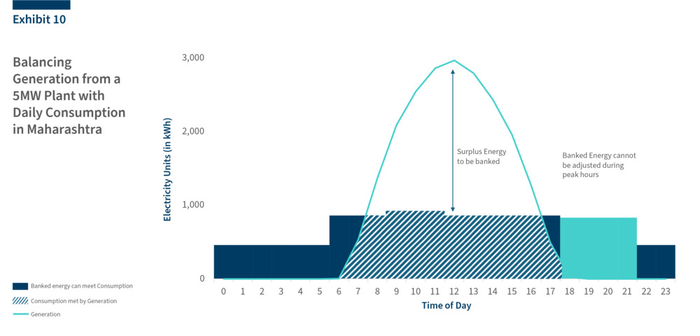 With stringent banking regulations and rising banking and open access charges for off-site projects across several states, a deeper dive into the hourly balancing of demand and supply from RE assets is recommended to account for losses due to transmission, wheeling and banking (Exhibit 10). Consumers with higher electricity demand during non-solar hours can evaluate wind based RE procurement or couple battery storage with their RE assets.