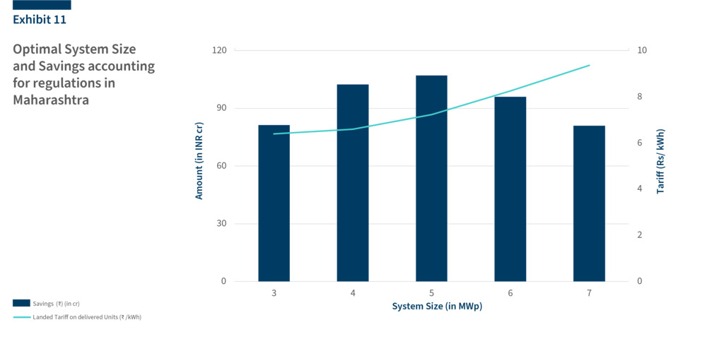 Exhibit 10 showcases how banking plays out on a daily basis. The 5MW solar plant produces surplus energy in the middle of the day that can be banked and utilised to cover consumption in off peak non-solar hours during the day and night. Given a specific quantum of electricity consumption, an undersized project may not meet demand adequately, while an oversized project can lead to excess generation and excess banking losses (either in electricity units or rupee terms). Exhibit 11 indicates where savings from RE procurement to meet the consumer’s consumption peaks at a project size of 5 MW, after which the savings decline.