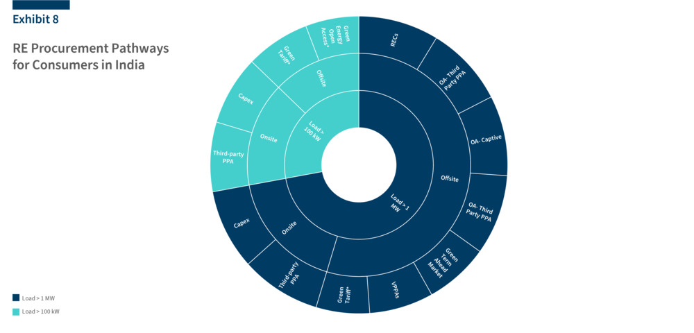Any outstanding demand can be met through off-site RE procurement options. For larger consumers with sanctioned load exceeding 1 MW, Open Access (OA) pathways can provide a viable solution, while Green Energy Open Access (GEOA) is ideal for those with a sanctioned load greater than 100 kW. This integrated approach allows consumers to fully utilize available on-site space to meet their RE requirements while maximizing savings. Exhibit 8 showcases the array of onsite and offsite RE procurement pathways for C&I consumers in India