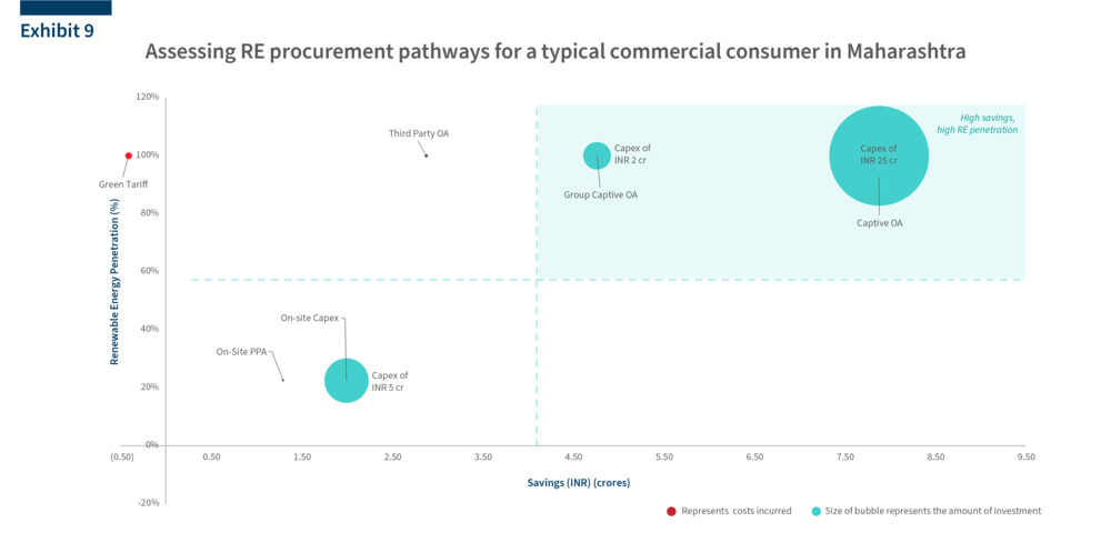 A critical takeaway from Exhibit 9 is that savings potential exists across a majority of RE pathways (except green tariffs) highlighting the tremendous opportunity that consumers can leverage by adopting RE. It indicates the impact of critical decision-making variables like consumer equity investment, on-site space availability and organisation targets on the procurement pathways which determines the overall economic savings for consumers. For instance, while onsite PPA requires no upfront investment from the consumer, the savings as well as RE penetration are limited by the space availability and hence, project size. Group Captive OA on the other hand, requires upfront investment, but has the most benefits in terms of potential for savings and RE penetration.