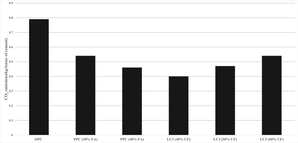Exhibit 1: Estimated CO2 emissions from production of OPC, PPC and LC3 with various clinker