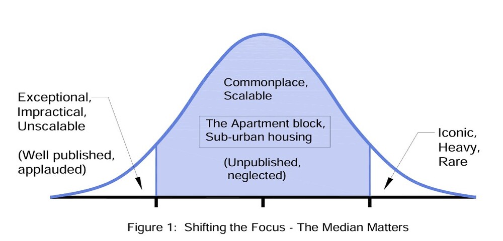 Instead, our focus should be on the median—the apartment blocks, suburban owner-developed housing, and other commonplace forms of construction. This is where the real impact lies. Unlike the leading edge of innovation, where isolated breakthroughs offer easy wins, or the trailing edge, where solutions are too conceptual to scale, the median is where meaningful, scalable improvements must happen.
