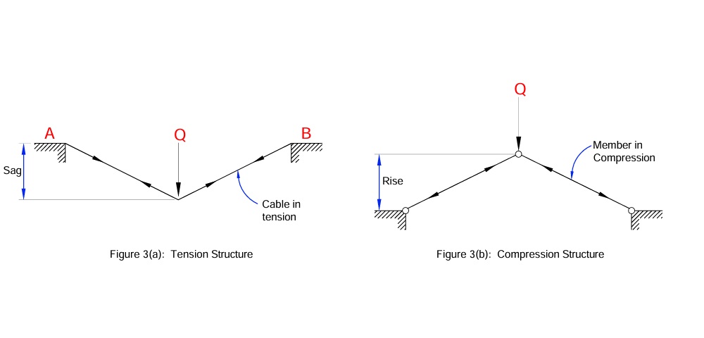 In tension or compression structures, the load is transmitted by a single state of stress as shown in Figures 3(a) and 3(b). The pure tension structure is form-active in that it take on a certain geometry for any given loading. It provides a highly efficient usage of material. The compression structure also can be quite efficient, but its load capacity is usually limited by buckling rather than by the inherent strength of the construction material.