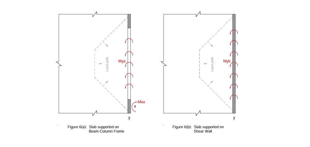 To illustrate the concept, consider two scenarios: (1) a slab supported on a beam-column frame, as depicted in Figure 6(a), and (2) a slab directly supported on a structural wall, as shown in Figure 6(b). In the beam-column framing, the beam and column sections must be designed to withstand the localized moments, denoted as Mxa. Conversely, when the slab is supported by walls, a wider slab section is designed to resist the bending moment per unit length, denoted as Myb. It is important to note that Mxa is significantly larger than Myb, and generally, this moment Myb falls within the slab's moment-resisting capacity.