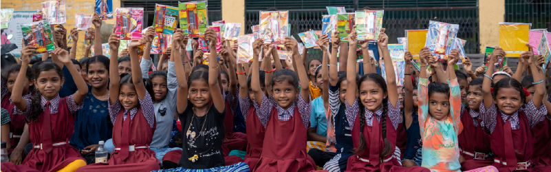 This was followed by some hula-hoops team games and distribution of Reading Literacy Tool Kits. The students from Khoni excitedly explored the tool kit that included flash cards, picture books, building blocks, storybooks (level 1, 2 & 3), worksheets, writing instruments (pencil, erasers), colours and drawing sheets! In addition to the fun and games, accompanying teachers from Lodha World School instructed the village students on how to solve the English worksheet while the SEWA volunteers helped them through it.